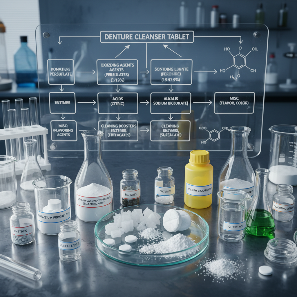 The primary active ingredients in denture cleaner tablets are strong oxidizing agents like sodium persulfate and sodium perborate, which are excellent for bleaching artificial teeth but too harsh for clear aligners.