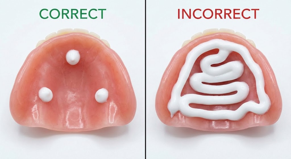 - Lower Denture: Apply two or three small dots along the ridge. The lower denture has less surface area, so precision is key.